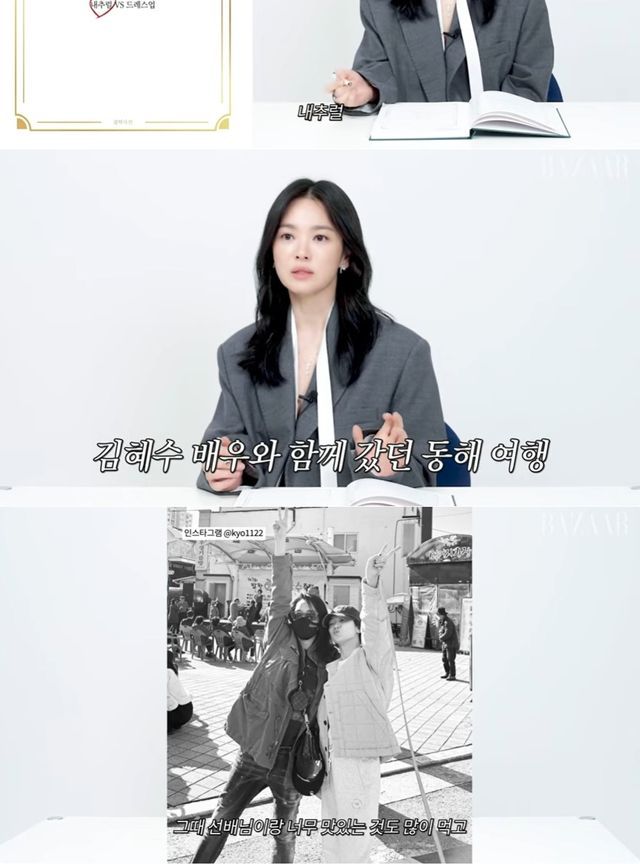 '마지막으로 간 여행지가 어디냐'고 묻자 송혜교는 "따로 '여행 가자'며 간 적이 거의 없다. 주로 일 때문에 갔다가 하루 이틀 쉬면 함께 간 스태프들과 시간 보내면서 와인 한 잔 한다"라며 "작년에 김혜수 선배와 동해 바다 여행을 했다. 그때가 마지막인 것 같다. 선배랑 맛있는거 많이 먹고, 바람 쐬고 예쁜 자연을 봤다. 힐링 했다"고 떠올렸다.