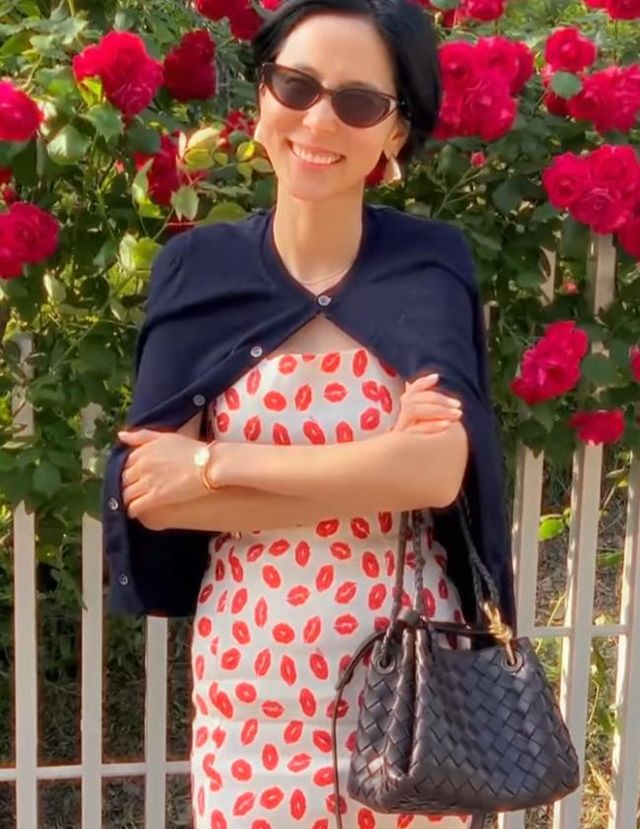 컬러 천재 김나영은 브라운 컬러 캣 아이 선글라스를 선택했습니다. 귀여운 레드 패턴 원피스에 빈티지한 무드의 캣 아이 선글라스를 매치해 사랑스럽기만 했던 룩에 세련된 무드를 가미해줬죠. 여기에 볼드한 골드 컬러 이어링과 뱅글로 스타일 지수를 한 층 업 시켰습니다.