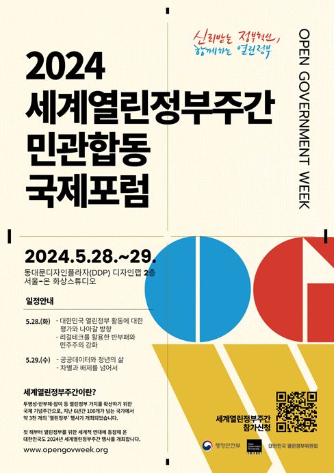 대한민국 열린정부위원회가 2024년 세계열린정부주간(5. 27.~5. 31.)을 맞아 주관하는 민관합동 국제포럼의 한 행사인 이번 토론회에는 29일 오후 1시 서울특별시 동대문디자인플라자에서 열린다.
