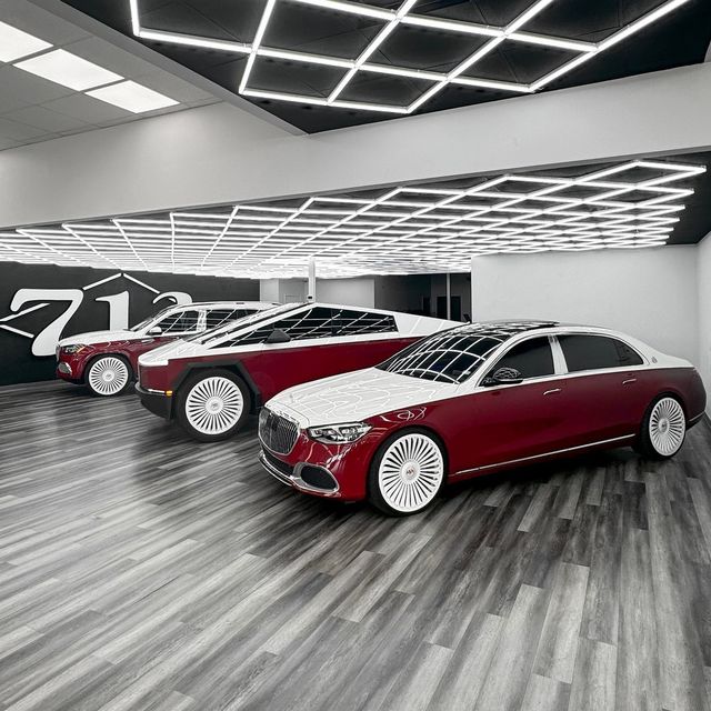 테슬라 사이버트럭과 두 대의 메르세데스 마이바흐 차량이 나란히 선 모습은 마치 이국적인 세쌍둥이처럼 화려함을 자랑한다.