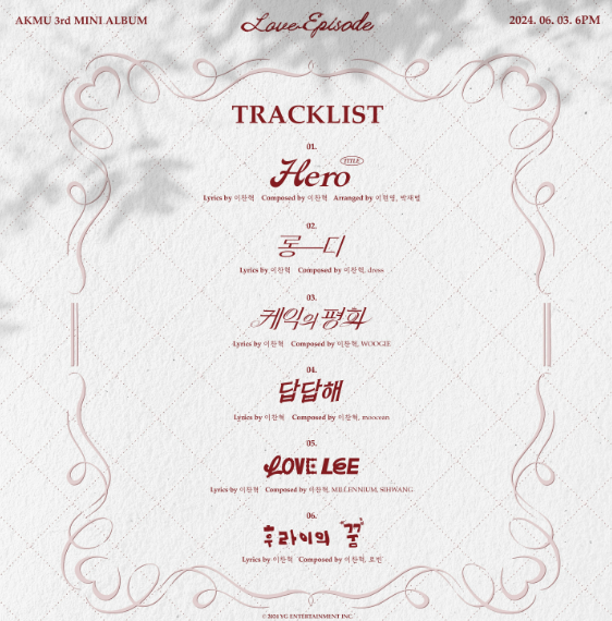 악뮤(AKMU)가 그들의 세 번째 미니 앨범 'LOVE EPISODE'의 트랙 리스트를 공개했습니다. 이번 앨범의 타이틀 곡은 'Hero'로, 앨범에는 총 6개의 트랙이 담겼다고 YG엔터테인먼트는 밝혔습니다.