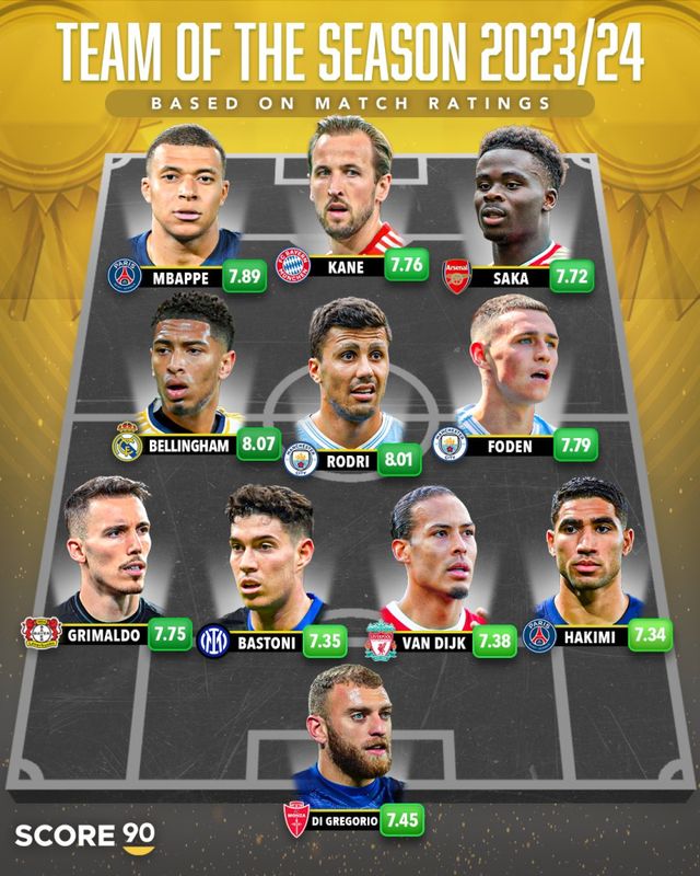 2023~24시즌 유럽 5대리그(잉글랜드·스페인·독일·이탈리아·프랑스)가 사실상 막을 내린 가운데 이번 시즌 평균 평점을 토대로 한 베스트11이 공개됐다. 그야말로 ‘초호화’ 라인업이다.