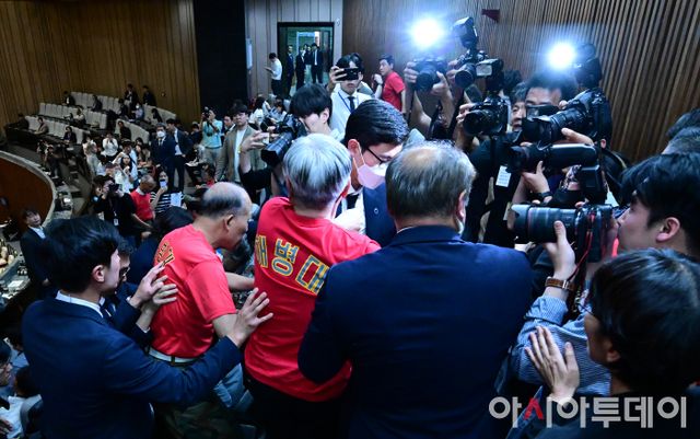 아시아투데이 이병화 기자 = 21대 국회 마지막 본회의가 열린 28일 국회 본회의장에서 해병대 예비역연대 회원들이 채상병 특검법(순직 해병 수사 방해 및 사건 은폐 등의 진상규명을 위한 특별검사의 임명 등에 관한 법률안 재의의 건)이 부결된 후 본회의장을 나서고 있다. 투표 결과 재석 의원 294명 중, 찬성 179표·반대 111표·무효 4표로 부결됐다.