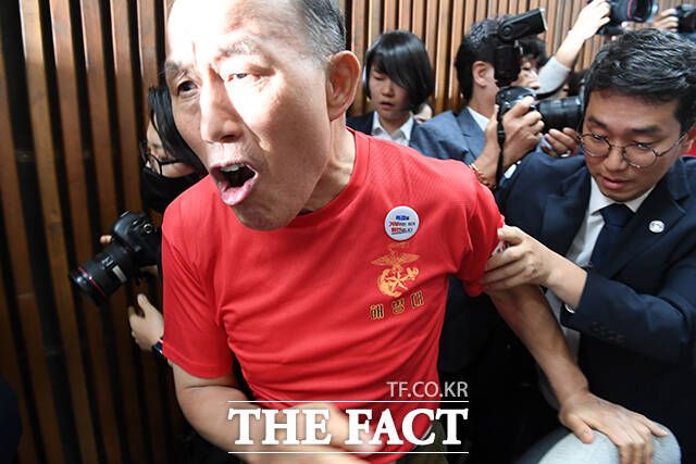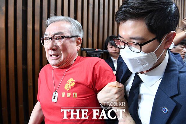 본회의장에서 고성으로 항의한 해병대예비역연대 회원이 방호 직원과 회의장 밖으로 향하고 있다.