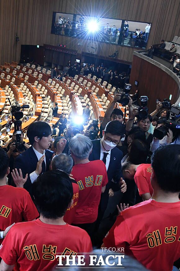 [더팩트ㅣ국회=남윤호 기자] 28일 오후 서울 여의도 국회에서 열린 본회의에서 해병대예비역연대 회원들이 '순직 해병 수사 방해 및 사건 은폐 등의 진상규명을 위한 특별검사 임명 등에 관한 법률안 재의의 건(채상병 특검법)' 재의결이 부결되자 퇴장하는 국회의원들에게 항의하고 있다.