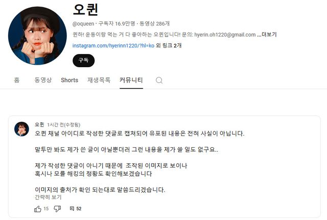 오퀸은 28일 자신의 유튜브 채널 커뮤니티 게시판에 "오퀸 채널 아이디로 작성한 댓글로 캡처되어 유포된 내용은 전혀 사실이 아니다"라는 글을 올렸다. 그는 "말투만 봐도 제가 쓴 글이 아닐 뿐더러 그런 내용을 제가 쓸 일도 없다. 제가 작성한 댓글이 아니기 때문에 조작된 이미지로 보이나 혹시나 모를 해킹의 정황도 확인해보겠다. 이미지의 출처가 확인되는 대로 말씀드리겠다"는 글을 올렸다.