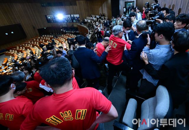 아시아투데이 이병화 기자 = 21대 국회 마지막 본회의가 열린 28일 국회 본회의장에서 해병대 예비역연대 회원들이 채상병 특검법(순직 해병 수사 방해 및 사건 은폐 등의 진상규명을 위한 특별검사의 임명 등에 관한 법률안 재의의 건)이 부결된 후 본회의장을 나서고 있다. 투표 결과 재석 의원 294명 중, 찬성 179표·반대 111표·무효 4표로 부결됐다.