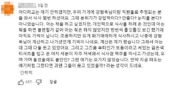 한 네티즌은 "어디라고는 얘기 안 하겠지만 우리 가게에 강형욱과 직원들로 추정되는 분들이 와서 식사를 몇 번 했다. 그때 분위기가 강압적이거나 눈치를 보는 느낌은 아니었다. 아는 척을 하고 싶었지만 개인적으로 식사를 하러 온 건데 아는 척을 하면 불편할까 봐 그러지 않았다. 한 번씩 흘깃흘깃 보기는 했다"고 밝혔다.