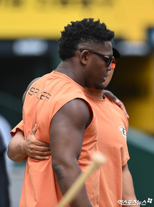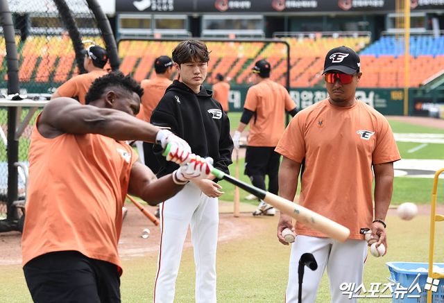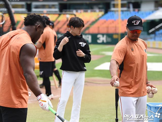 이후 페라자의 타격 훈련을 체크하며 티 배팅 공을 직접 올려주던 정경배 대행 곁으로 산체스가 다가왔고, 정 대행과 악수를 나눈 뒤 격려를 하듯 어깨를 여러 차례 두드리며 미소를 보냈다.