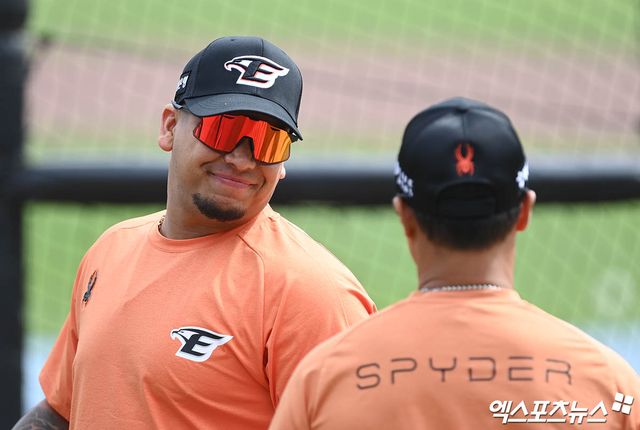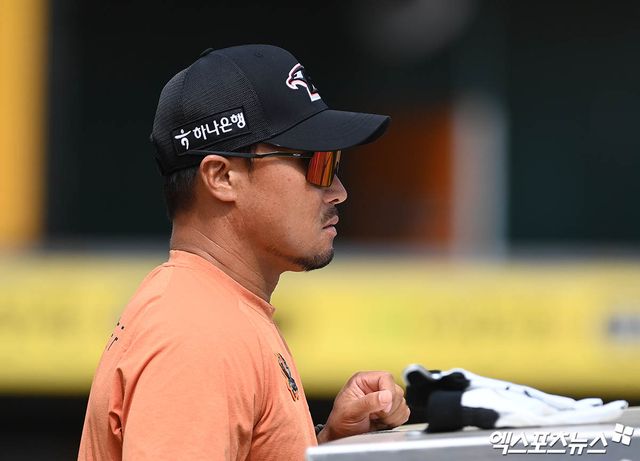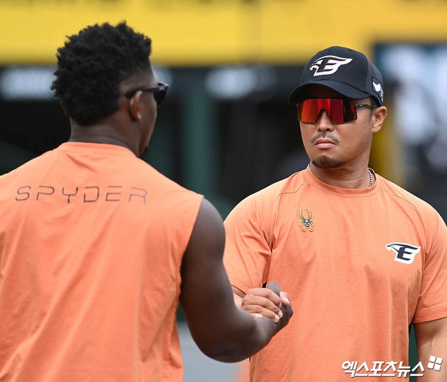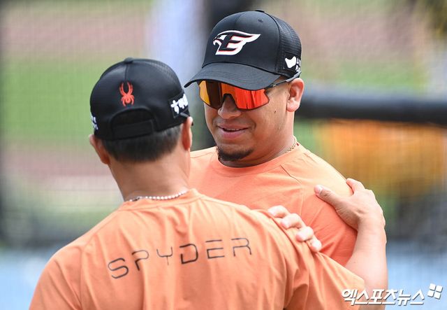 이날 정경배 감독 대행은 일찍부터 그라운드에 나서 선수단 훈련을 지켜봤다. 훈련을 위해 그라운드에 모습을 드러낸 외국인 타자 페라자가 정 대행과 손을 맞잡으며 평소와 다름 없이 반갑게 인사를 나눴다.