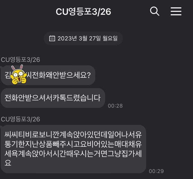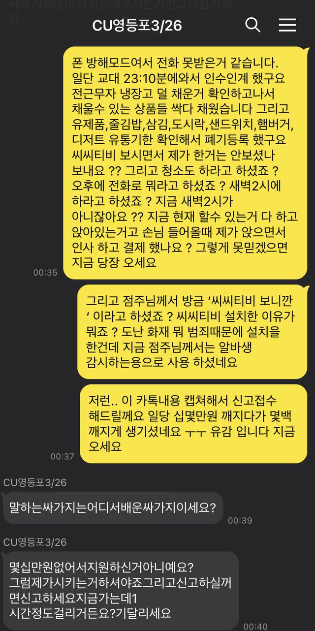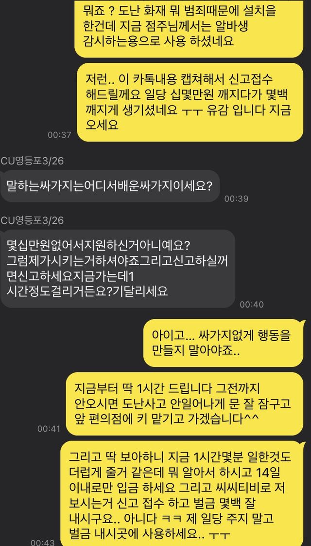 지금 현시간부로 씨씨티비 ㅂㅈ 말아주시구요 저 다음 교대자 한테 말씀해서 청소,쓰레기,매대,워크인 다 잘했나 확인 하세요 아니시면 직접 오셔서 확인 하시구요 그리고 신고는 안해드릴께요