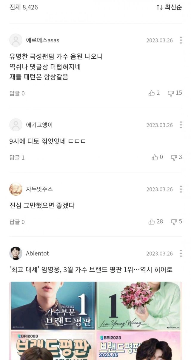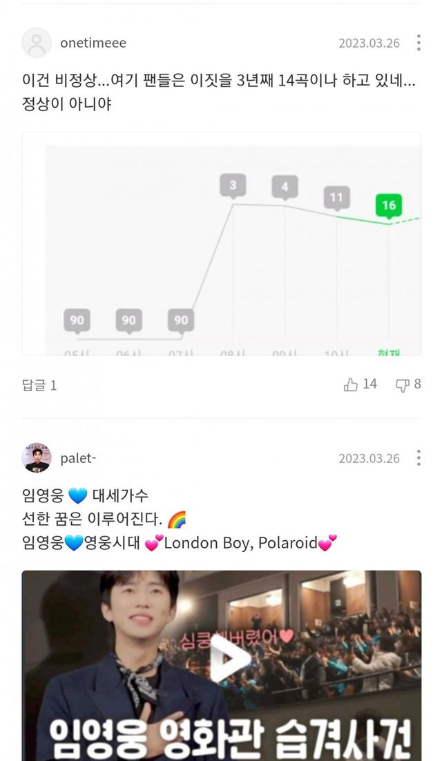 임영웅에게 실시간으로 아이돌가수 순위 따일때마다 팬들이 임영웅노래에 몰려가 댓글 오지게 달아서 댓글 수만 8천개가 넘어가고