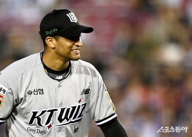 28일 서울 잠실야구장에서 \'2024 신한은행 SOL뱅크 KBO리그\' KT 위즈와 두산 베어스 경기가 열렸다. 선발 투수로 등판한 KT 쿠에바스가 4회말 2사 1,3루 상황에서 삼진으로 이닝을 마친 후 웃고 있다. 잠실 | 김종원 기자 won@donga.com