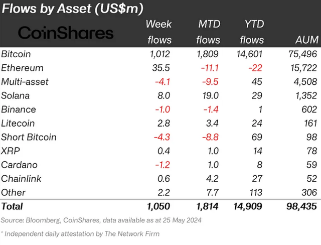 암호화폐 자산 운영사 코인셰어즈의 주간 자금 흐름 보고서에 따르면 지난주(5월 20일~26일) 디지털 자산 투자 상품은 3주 연속으로 유입이 이어지며 총 10억 5천만 달러의 자금이 들어왔고, 올해 누적 유입액은 149억 달러로 사상 최고치를 기록했다.