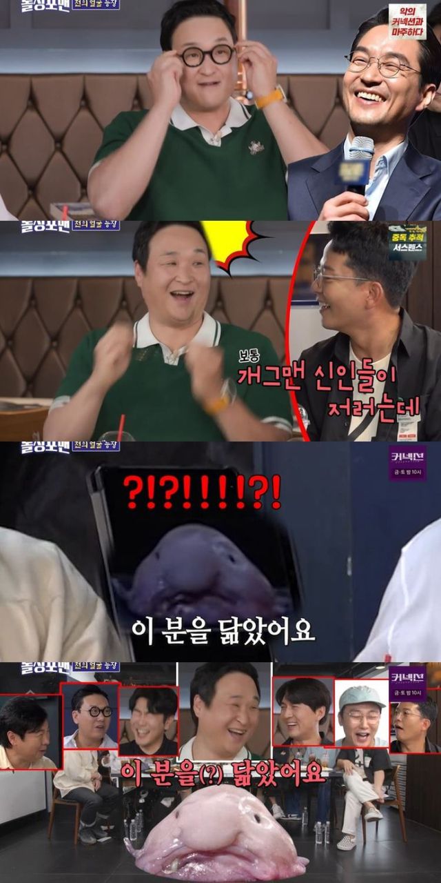 이를 본 김준호는 “개그맨 신인들이 저러는데, 성환 씨는 배우 아니냐”며 신기해했다. 이상민은 “이 분도 닮았다”라며 블로브피쉬 사진을 꺼내 웃음을 자아냈다.