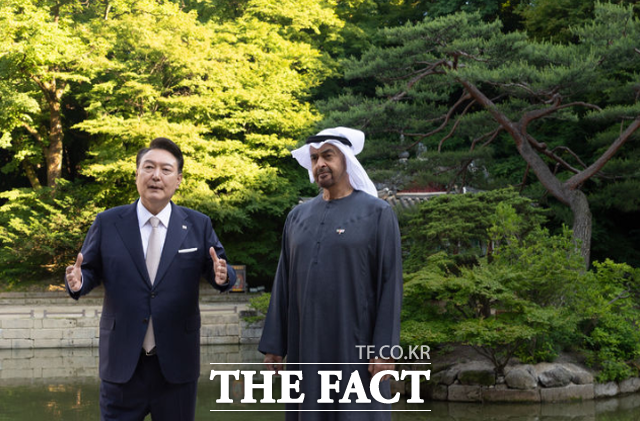 [더팩트ㅣ용산=박숙현 기자] 윤석열 대통령은 28일 첫 국빈 방한한 모하메드 빈 자이드 알 나흐얀(Mohamed bin Zayed Al Nahyan) 아랍에미리트연합국(UAE) 대통령과 창덕궁 산책과 전통 공연을 관람하며 친교 시간을 가졌다.