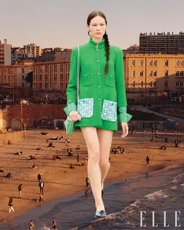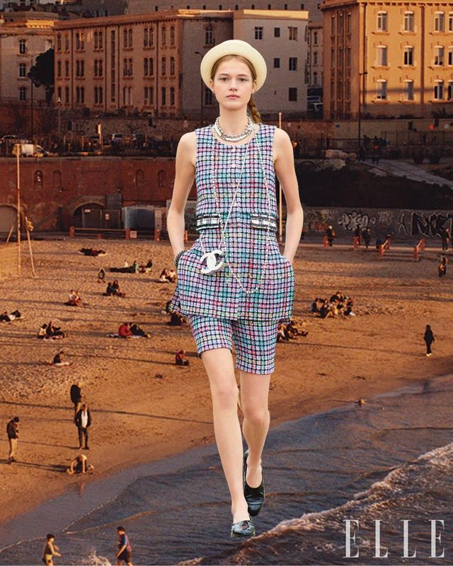 버지니 비아르가 크루즈 컬렉션에 대해 설명했다. 아니스 그린 컬러의 샤넬 수트와 1960년대 분위기의 드레스를 시작으로 다이빙 후드와 함께 스타일링한 클래식 트위스 재킷과 스윔수트가 등장했다. 이번 컬렉션은 바닷속 동화처럼 몽상적인 요소를 접목했다고.