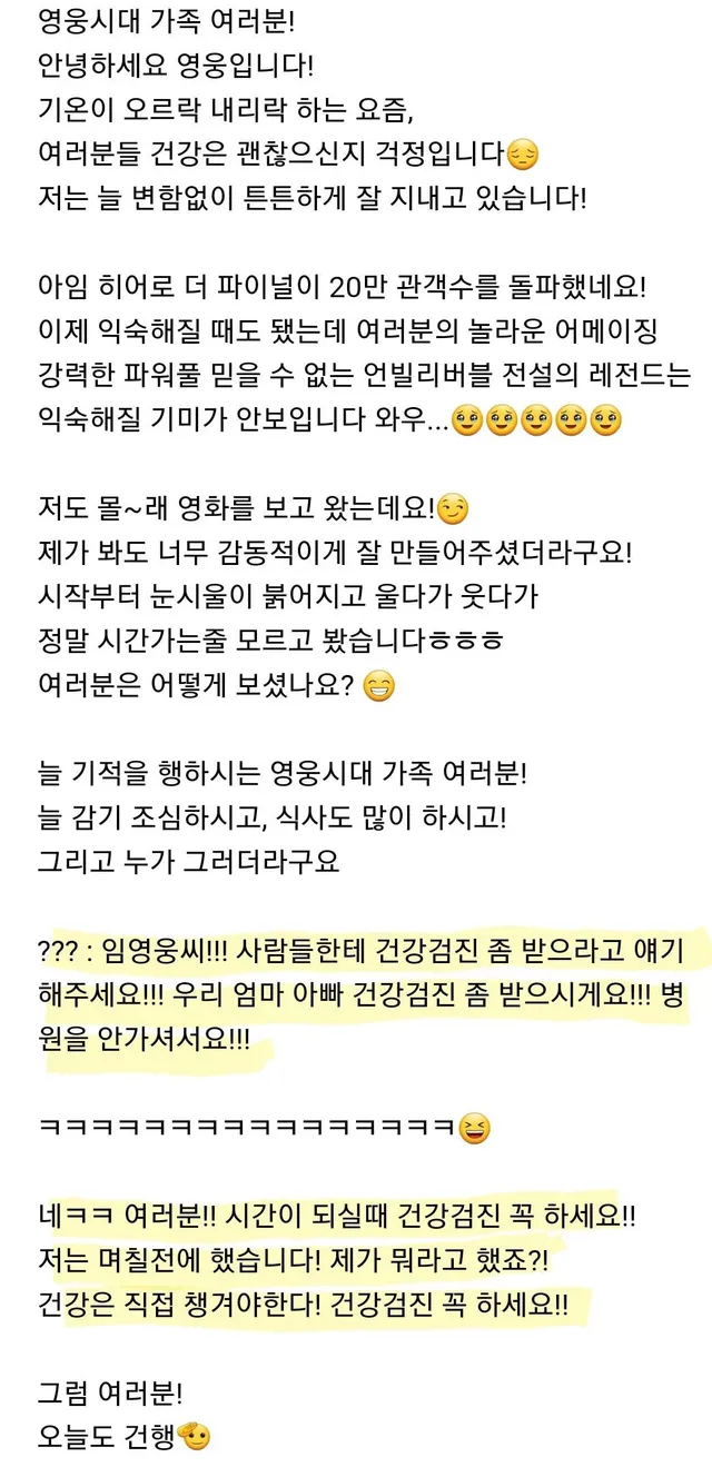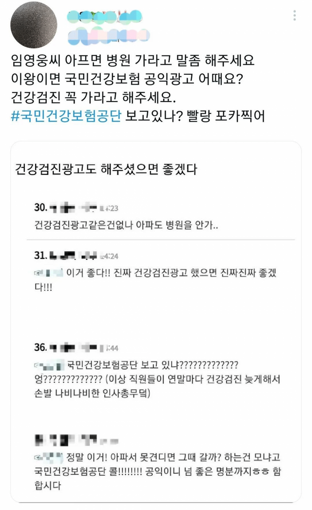 실제로 임영웅이 이렇게 언급하고난다음 건강검진률 존나 올랐다고함 ㅋㅋ