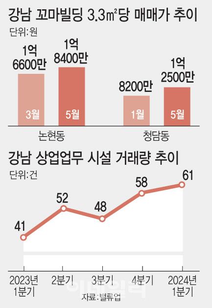 밸류맵에 따르면 강남 상업업무 시설 거래량은 작년 △1분기 41건 △2분기 52건 △3분기 48건 △4분기 58건에 이어 올해 1분기 61건을 기록했다. 그간 서울 강남 지역의 꼬마빌딩 매매가격은 2022년 3분기 3.3㎡당 1억8828만원까지 올랐다가 하락세를 이어갔다. 하지만 작년 하반기부터 거래가 조금씩 늘면서 올해 1분기 3.3㎡당 1억7503만원까지 올랐다.