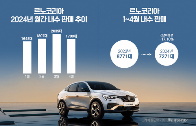 신차가 없었던 르노코리아는 국내에 생산공장을 두고도 월 2000대를 밑도는 내수 실적을 기록해 왔다. 아르카나는 셀토스, 코나 등 경쟁자들에 밀렸고, QM6와 SM6는 2016년 출시 이후 8년째 판매되고 있는 노후차종이다. 올해 르노코리아의 내수 판매량은 1월 1745대, 2월 1807대, 3월 2039대, 4월 1780대에 그쳤고 누적 판매량(8771대)는 전년 동기 대비 17.1%나 급감했다.