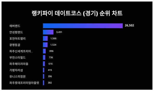 랭키파이가 빅데이터로 분석한 결과에 따르면 에버랜드가 1위로 선두를 달리고 있다. 뒤를 이어 2위 안성팜랜드, 3위 포천아트밸리 순으로 나타났다.