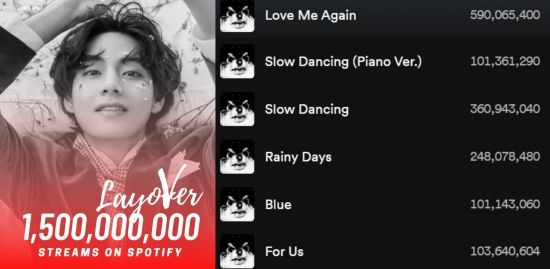 스포티파이에 따르면, 최근 방탄소년단(BTS) 뷔의 솔로 앨범 '레이오버' 앨범이 총 15억 스트리밍을 돌파했다.