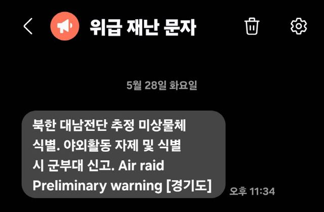 앞서 경기도는 전날 오후 11시 34분 경기북부지역 일대 주민에 ‘북한 대남전단 추정 미상물체 식별. 야외활동 자제 및 식별 시 군부대 신고. Air raid Preliminary warning[경기도]’라고 쓴 위급 재난 문자를 발송했다.