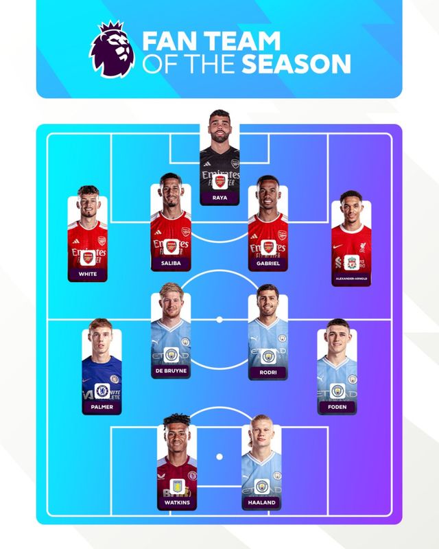 팀별로는 ‘챔피언’ 맨시티와 2위 아스널에서 각각 4명씩 나왔다. 리버풀과 애스턴 빌라에서 1명씩, 그리고 EPL 6위 첼시에서도 1명이 나왔다. 첼시 선수로는 유일하게 이름을 올린 팔머는 이번 시즌 EPL 영플레이어상을 받은 선수다. 토트넘에서는 손흥민을 포함해 1명도 팬들의 선택을 받지 못했다.