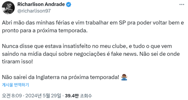 히샤를리송은 29일(한국시간) 자신의 소셜미디어(SNS) 계정을 통해 “좋은 모습으로 복귀해서 다음 시즌을 준비할 수 있도록 휴가를 반납했다. 나는 우리 팀에 불만이 있다고 말한 적 없다. 미디어를 통해 흘러나오는 이적설은 모두 ‘가짜 뉴스’다. 도대체 어디서 나온 이야기인지 모르겠다. 나는 다음 시즌 잉글랜드를 떠나지 않을 것”이라고 전했다.