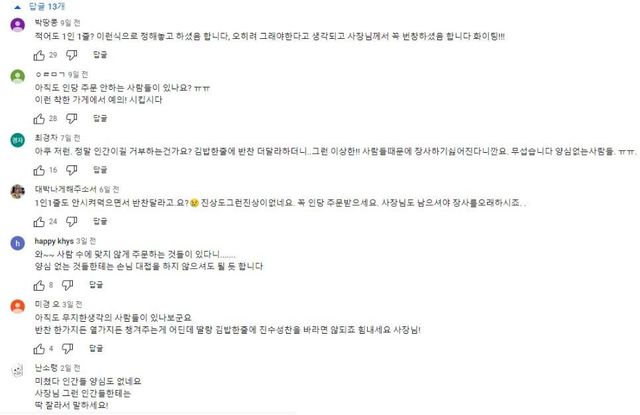유튜브에 나온대로 반찬 왜 안나오냐고 하는 사람들이 있어서 곤란함을 겪고 있다고 사장이 댓글 남김