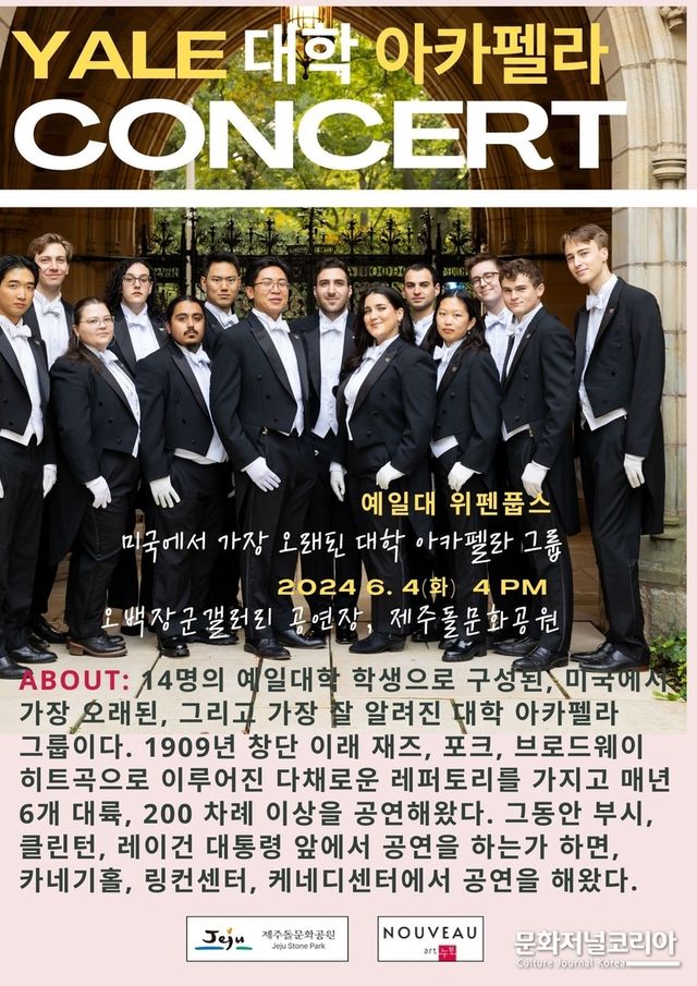 문화저널코리아 오형석 기자 | 미국 예일대학교 아카펠라 그룹 ‘위펜풉스(Whiffenpoofs)가 오는 6월 4일(화) 오후 4시 제주돌문화공원 오백장군갤러리 공연장에서 공연을 펼친다. 이번 공연은 제주돌문화공원(소장 김동희)과 공간 누보(대표 송정희)가 공동으로 진행하는 행사다.