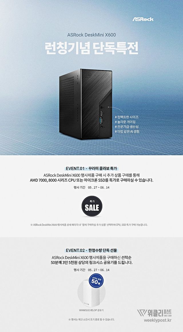 ASRock DeskMini X600 제품은 미니PC 제품으로, 컴팩트한 사이즈에 전문가급 생산성을 지녔다. 사무용, 가정용 등 다양한 환경에서 사용할 수 있다. 행사는 5월 27일부터 6월 14일까지 진행한다.