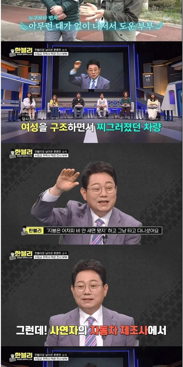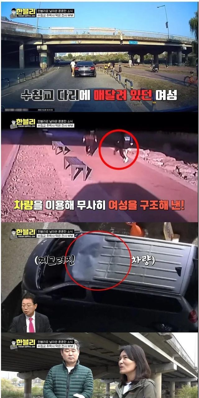 20대 여성이 다리에 매달려있는거 보고 부부가 차 아래에 대서 차위로 떨어지게 해서 살림