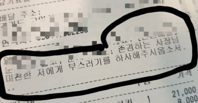해당 글에는 한 손님이 주문한 유명 치킨 프랜차이즈 주문 영수증이 담겼다. 영수증에 따르면 이 손님은 치킨과 떡볶이를 주문한 뒤 한 가지 배달 요청을 적었다. ‘존경하는 사장님 미천한 저에게 부스러기를 하사해 주시옵소서’라는 내용이었다.