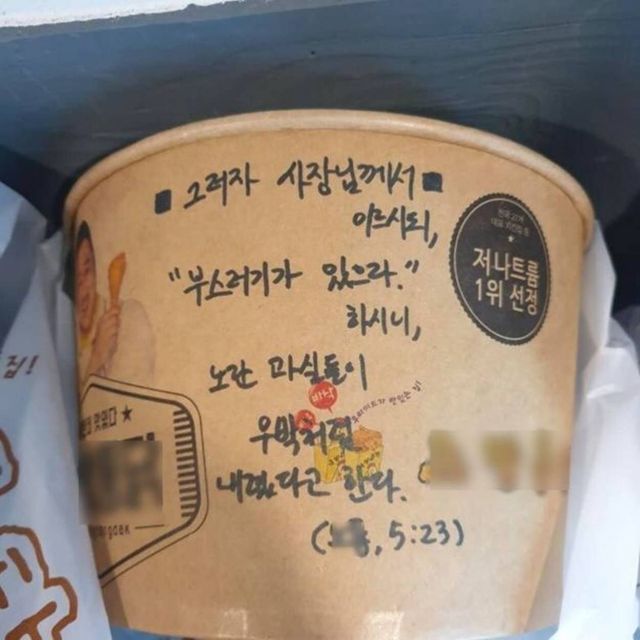 업주는 치킨 통에 손글씨로 직접 메시지를 적었는데 ‘그러자 사장님께서 이르시되 '부스러기가 있으라' 하시니, 노란 과실들이 우박처럼 내렸다고 한다’고 재치 있게 응수했다.