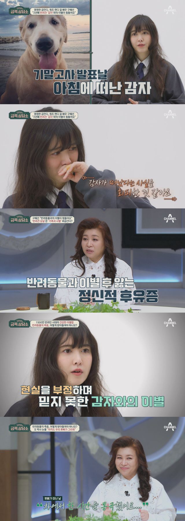 한편 구혜선은 “반려동물과의 이별을 받아들이기 어려워요”라는 고민을 고백한다. 구혜선은 가족 같았던 반려견 감자와의 이별을 회상. “사람은 장례를 치르는데 강아지가 죽었다고 그럴 수는 없잖아요”라며 슬픔을 누르고 학교로 가야 했다고 토로한다. 이어 반려견이 떠난 후 현실감이 없었고 떠났다는 사실을 회피했다고 고백한다.