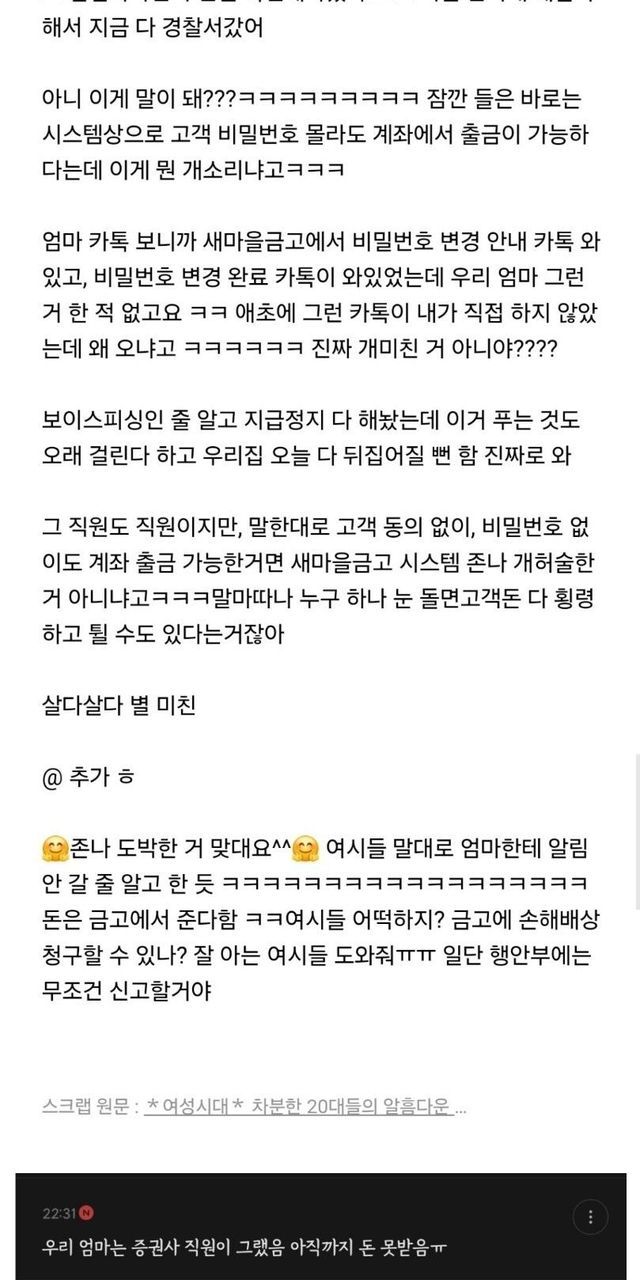 B 씨는 “어머니 통장에서 출금하려다 고객의 통장에서 잘못 출금했다”고 해명한 것으로 전해졌다.