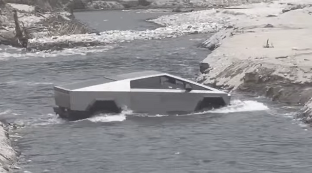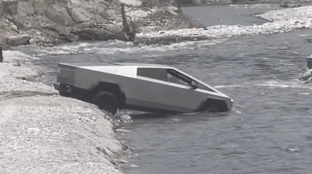 어떤 때는 해변의 부드러운 모래가 문제고, 때로는 흙 언덕에서 가지에 걸리기도 한다. 이번엔 흐르는 강물과 가파른 둑 사이에 갇힌 은색의 사이버트럭이 오도 가도 못하는 모습이 포착됐다.