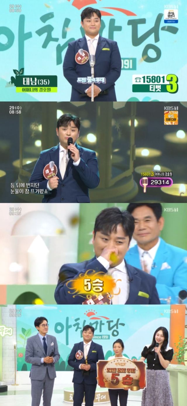 태남은 29일 KBS1 ‘아침마당 - 도전 꿈의 무대’에 출연, 드라마틱한 성공신화를 썼다. 앞서 3승과 패자부활전 1승까지 총 4승을 거머쥔 태남은 마지막 출연인 이날 무대에서 5승 도전에 성공했다.