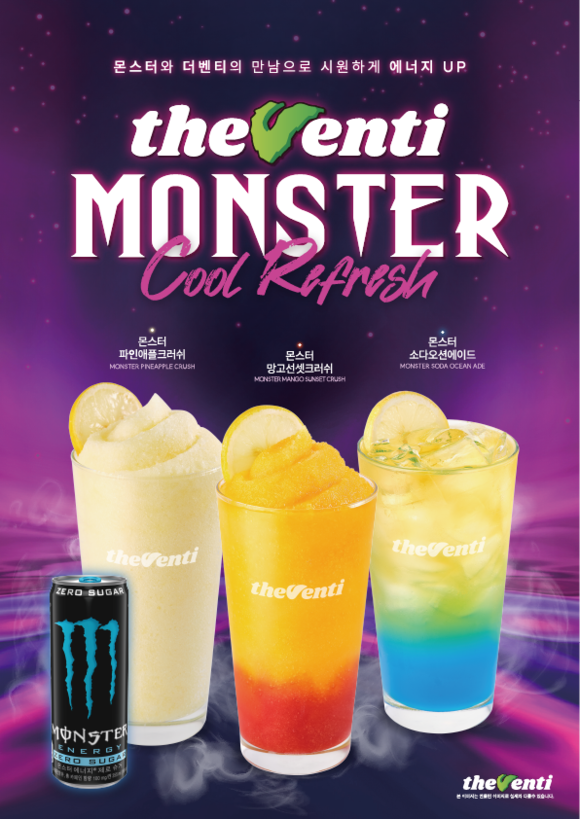 더벤티는 '몬스터 제로슈거'를 활용했다. 신메뉴는 △몬스터 망고선셋 크러쉬 △몬스터 파인애플 크러쉬 △몬스터 소다오션 에이드 3종이다.