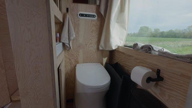 입구 바로 앞에는 작은 욕실이 있다. 큰 창문과 커튼, 선반, 거울, 샤워 부스로 구성돼 있으며, 가장 흥미로운 점은 ‘신데렐라 소각식 변기’를 비치했다는 것이다. 소각식 변기는 전기와 프로판을 사용해 모든 것을 태워버리는 식으로 작동한다. 남은 재 역시 무균 상태로 저장돼 처리가 간편하다.