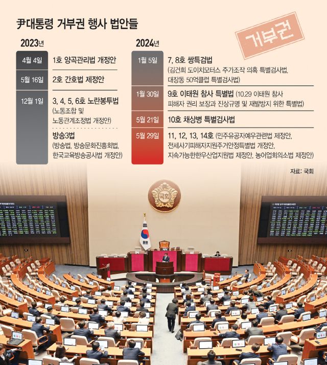 당과 소통에도 각별한 공을 들였다. 전날 본회의 종료 후 추경호 원내대표가 지도부와 머리를 맞댔고 곧장 대통령실과 소통했다. 세월호참사 특별법을 수용한 데도 여당의 의견이 반영됐다. 추 원내대표는 이날 오전 기자회견을 열고 "대통령께 재의요구권 행사를 건의하지만, 세월호 피해자들의 의료비 지원 기한을 연장하는 법안은 건의하지 않겠다"고 밝혔다. 추 원내대표는 윤 대통령의 정치적 부담을 염두에 둔 듯 "거대 야당의 일방독주 악법이 없다면 재의 요구권 행사도 없다"고 강조했다.