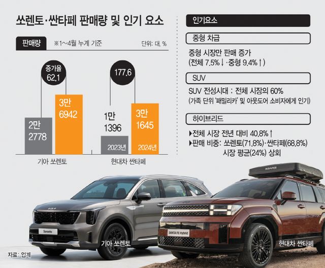업계 관계자는 "지난해 국산 중형 SUV 연간 판매량이 5년 만에 20만대를 넘어설 정도로 소비자에게 많은 인기를 얻고 있다"며 "구매력을 갖춘 소비자가 중형 SUV 하이브리드 모델을 많이 찾아 당분간 쏘렌토와 싼타페의 고공행진은 이어질 것으로 전망된다"고 밝혔다.