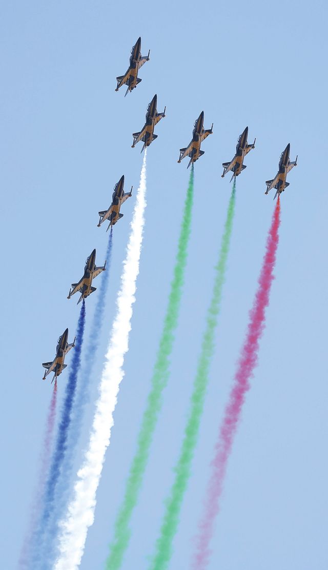 윤 대통령 내외와 알 나흐얀 대통령은 함께 블랙이글스 축하 비행을 관람했다. 국가는 UAE 국가, 애국가 순으로 연주됐다. 블랙이글스는 윤 대통령과 알 나흐얀 대통령이 걸어갈 때 이들이 걷는 방향으로 비행하기도 했다. 두 정상은 블랙이글스 축하 비행을 관람한 이후 잔디마당으로 이동하자 어린이 환영단은 양손에 태극기와 UAE기를 흔들었다. 어린이들은 아랍어로 "앗살라무 알라이쿰(안녕하세요)"이라고 인사하기도 했다. 두 정상은 각 수행원들을 서로에게 소개하고 대통령실 청사로 이동했다.