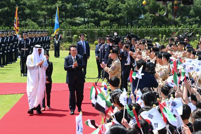 용산어린이정원부터는 100여 명의 전통 군악대와 의장대가 아리랑을 연주하며 알 나흐얀 대통령을 맞았다. 노란색 전통복을 입은 군악대가 앞에 서고 그 뒤를 전통 기수단이 따랐다. 대통령실 정문 양측에는 태극기와 UAE 국기가 좌우로 각각 3쌍씩 배치됐다. 용산 대통령실 잔디마당에서 열린 공식 환영식에는 군악대와 의장대 아크부대원 90여 명, 어린이 환영단 120여 명 등이 자리했다. UAE 측 차량이 대통령실 안으로 진입하자 군악대 연주가 시작됐고, 알 나흐얀 대통령이 차에서 내리자 윤 대통령과 김건희 여사가 함께 반갑게 맞이했다.
