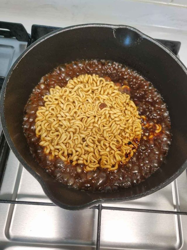 짜파게티 면이 수프와 함께 끓고 있다 / 위키트리