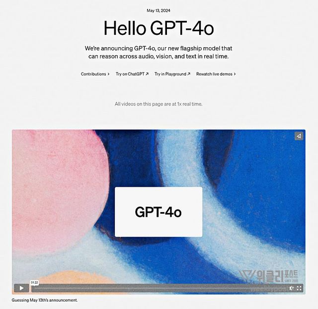 생성형 AI의 선두주자인 오픈 AI가 지난 14일(미 현지 시간 13일) GPT4의 업그레이드 버전인 GPT-4o를 출시했다. 대화에 감정을 실을 수 있게 되었고, 대화의 속도도 실시간에 가깝게 빨라졌다. 가장 눈에 띄었던 부분은 동시통역이었는데 마치 한 명의 동시통역사를 가운데 둔 듯이 한 명은 이탈리아어로, 한 명은 영어로 대화하며 자연스럽게 이어가는 모습이 인상적이었다.