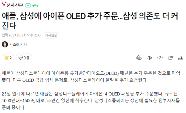 해외 디스플레이 업체의 제조 문제로 전해짐