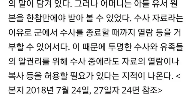 「유족들은 군 수사기록을 열람하는 과정에서도 부당한 대우를 받았다고 주장했다. 조 일병 어머니는 "수사 관계자가 본인 약속이 있다면서 300~400장에 달하는 수사기록을 1시간 안에 보라고 했다"며 "매일 방문해 자료를 3~4장씩 보겠다고 하니 '이러시는 목적 무엇이냐, 이런다고 죽은 아이가 살아오느냐'는 면박을 당했다"고 했다. 조 일병 유족은 수사팀 관계자 2명을 모욕 혐의로 군 검찰에 고소했다.」
