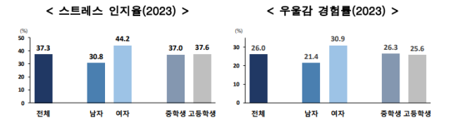 중학생(26.3%)의 우울감 경험률이 고등학생(25.6%)보다 소폭 높았고, 여학생(30.9%)이 남학생(21.4%)보다 우울감을 더 많이 느꼈다.